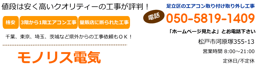 足立区の格安!エアコン取り付け、取り外し工事専門!モノリス電気
