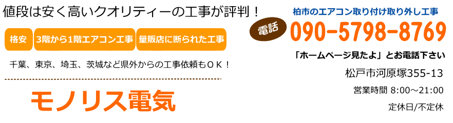 柏市の格安!エアコン取り付け、取り外し工事専門!モノリス電気