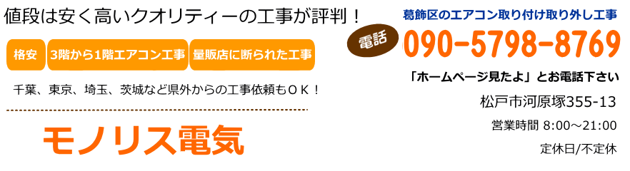 葛飾区の格安!エアコン取り付け、取り外し工事専門!モノリス電気