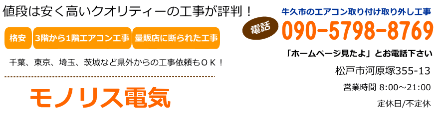 牛久市の格安!エアコン取り付け、取り外し工事専門!モノリス電気